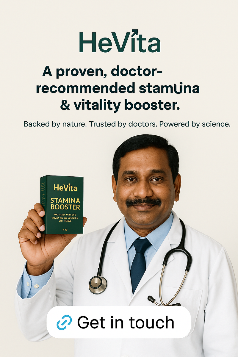 HeVita was born with a mission to blend the wisdom of Ayurveda with modern science to create safe, effective, and transparent supplements. Our goal is to restore stamina, energy, and confidence naturally.Founder’s Note: “Every sachet of HeVita is crafted with authenticity and care – designed to empower you with more strength, vitality, and trust.”Why HeVita is Different – Science + Ayurveda: HeVita Stamina Booster is a clinically researched Ayurvedic formulation made with premium herbal extracts like Ashwagandha, Korean Red Ginseng, Shilajit, Maca, and Tongkat Ali. Backed by AYUSH approval and manufactured in a GMP-certified facility, it is tested for purity and safety. This 100% natural, non-steroidal supplement supports stamina, energy, and hormonal balance with visible results in 3–6 weeks. License No: AS/VLNEO/068122 Mfg. License No: MFG NO 1115-ISM(HR)