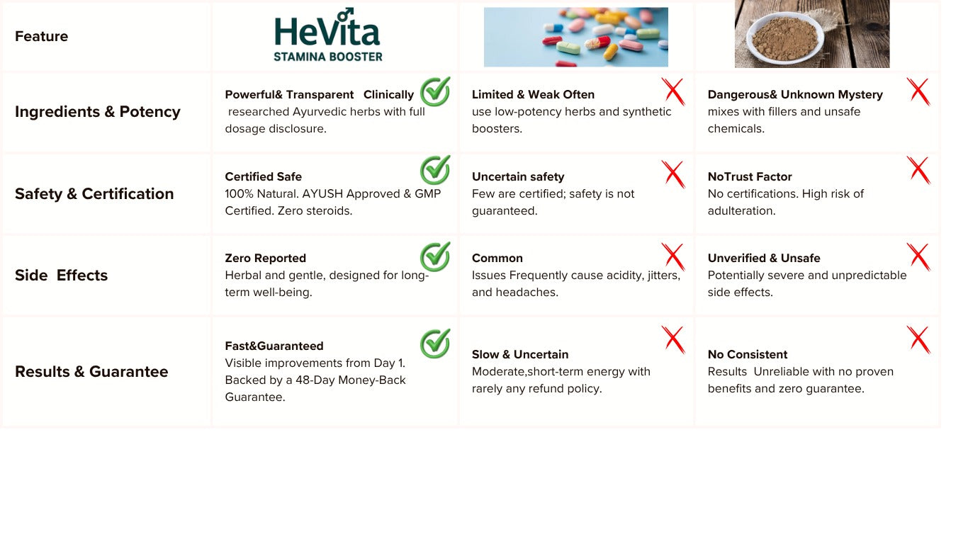 HeVita is powered by clinically researched herbs that naturally boost stamina, vitality, and confidence. Each ingredient is carefully chosen to support men’s wellness without harmful side effects. Unlike chemical shortcuts or synthetic boosters, HeVita is 100% natural and safe. With no steroids and no compromises, it delivers results backed by science and Ayurveda you can trust.